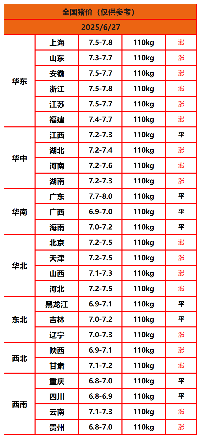 2025年6月27日猪价,今日全国猪价行情走势:18涨8平0跌。