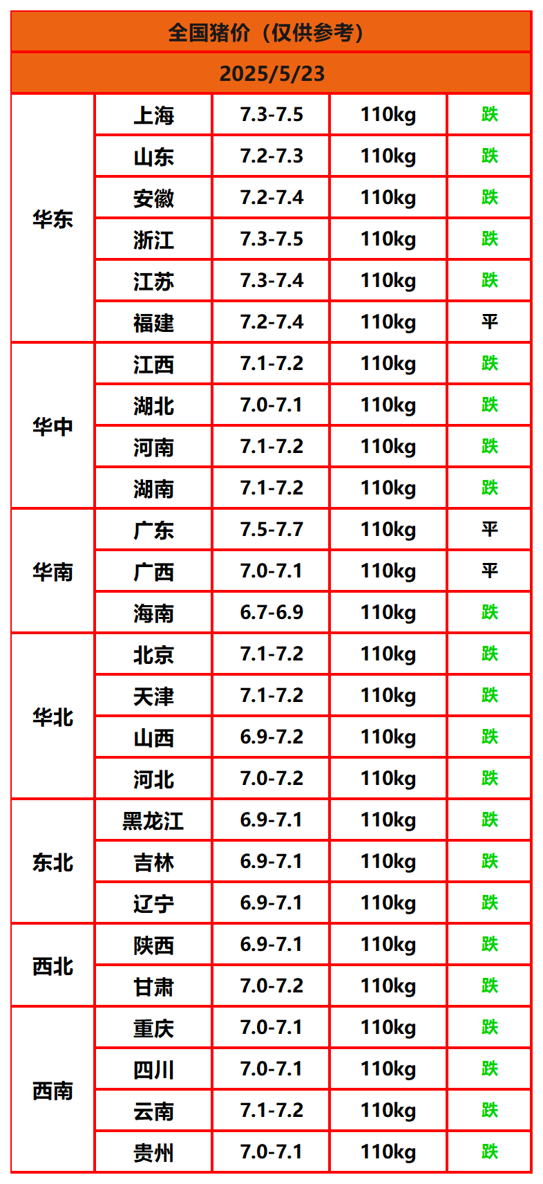 2025年5月23日猪价,今日全国猪价行情走势:0涨3平23跌。