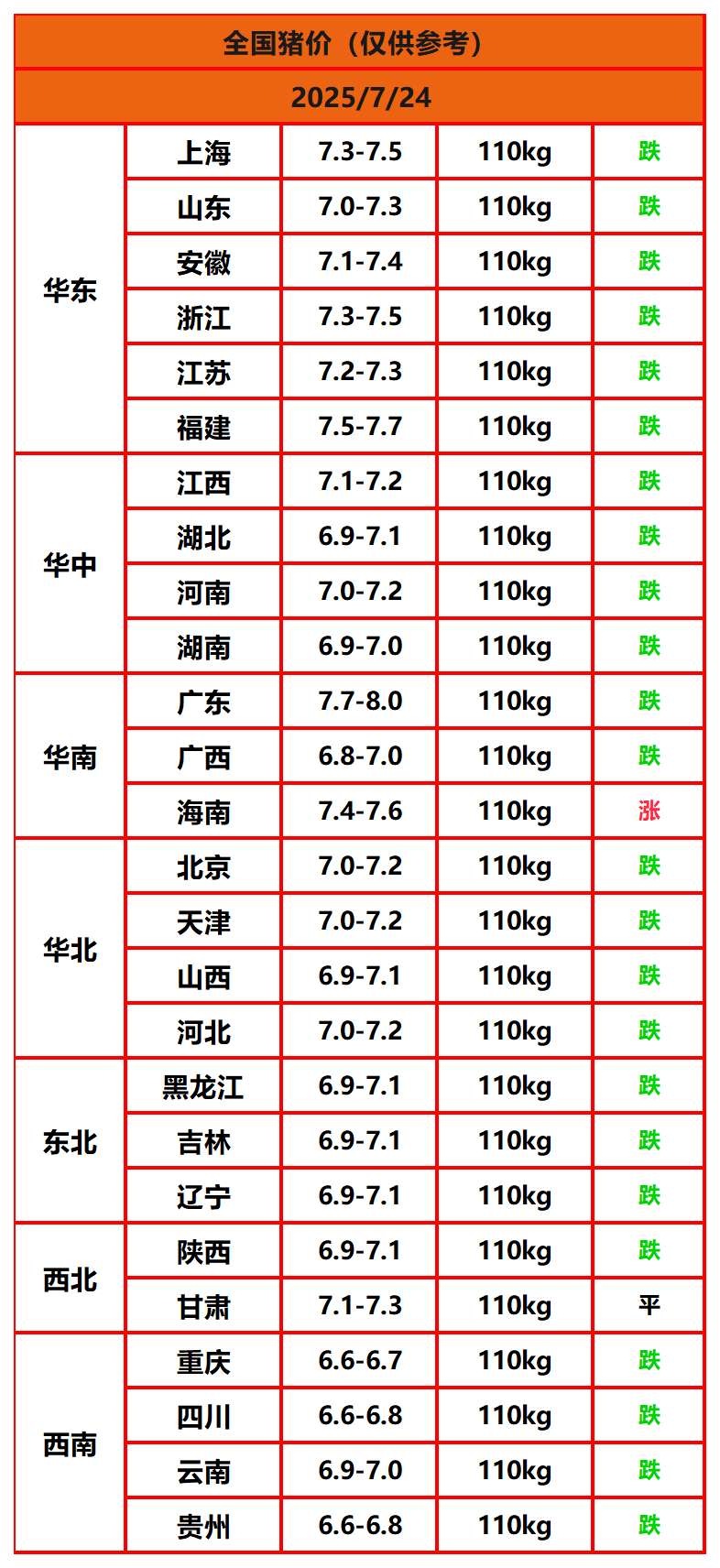 2025年7月24日猪价,今日全国猪价行情走势:1涨1平24跌。