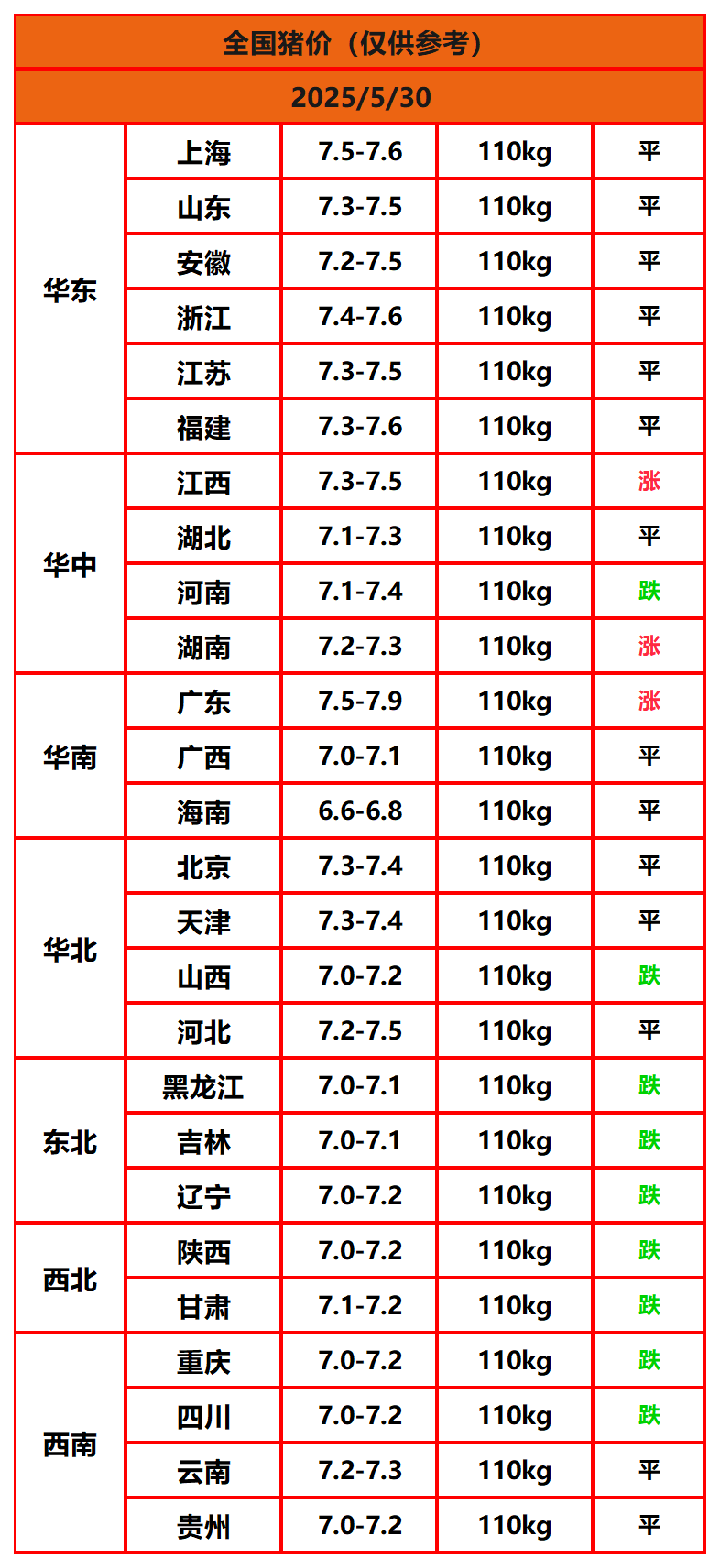 2025年5月30日猪价,今日全国猪价行情走势:3涨14平9跌。