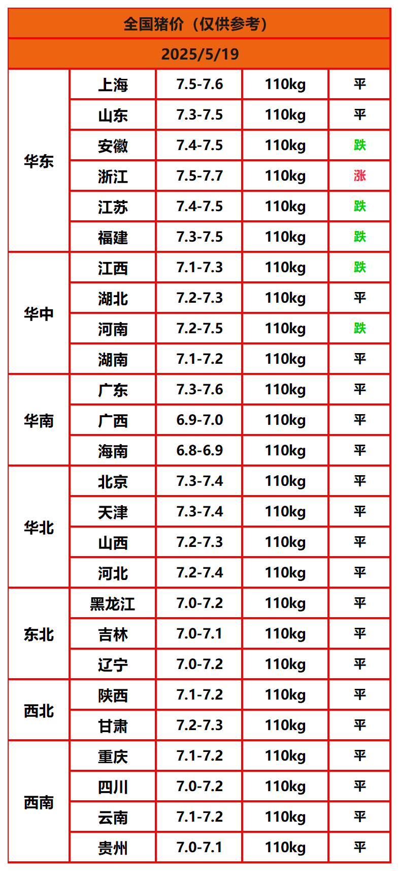 2025年5月19日猪价,今日全国猪价行情走势:1涨20平5跌。