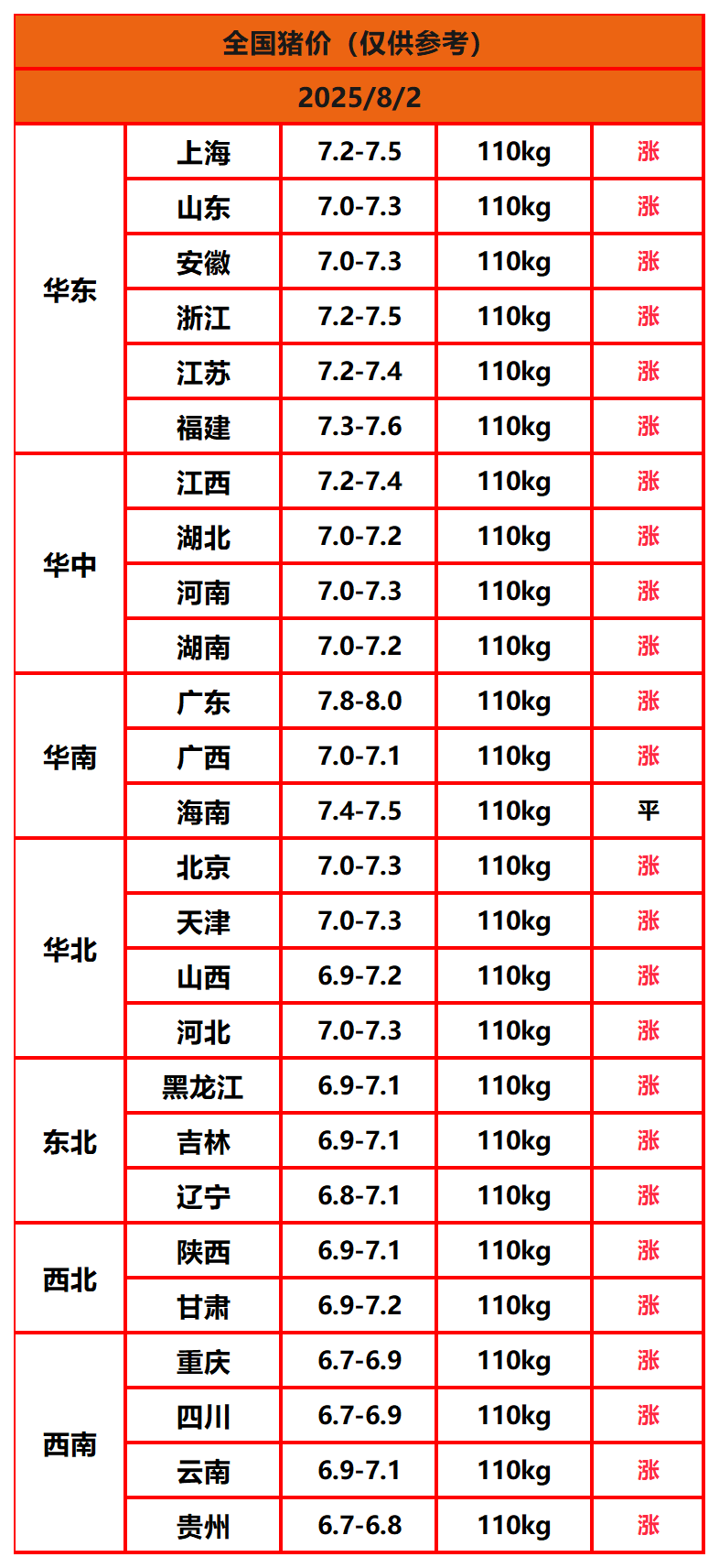 2025年8月2日猪价,今日全国猪价行情走势:25涨1平0跌。